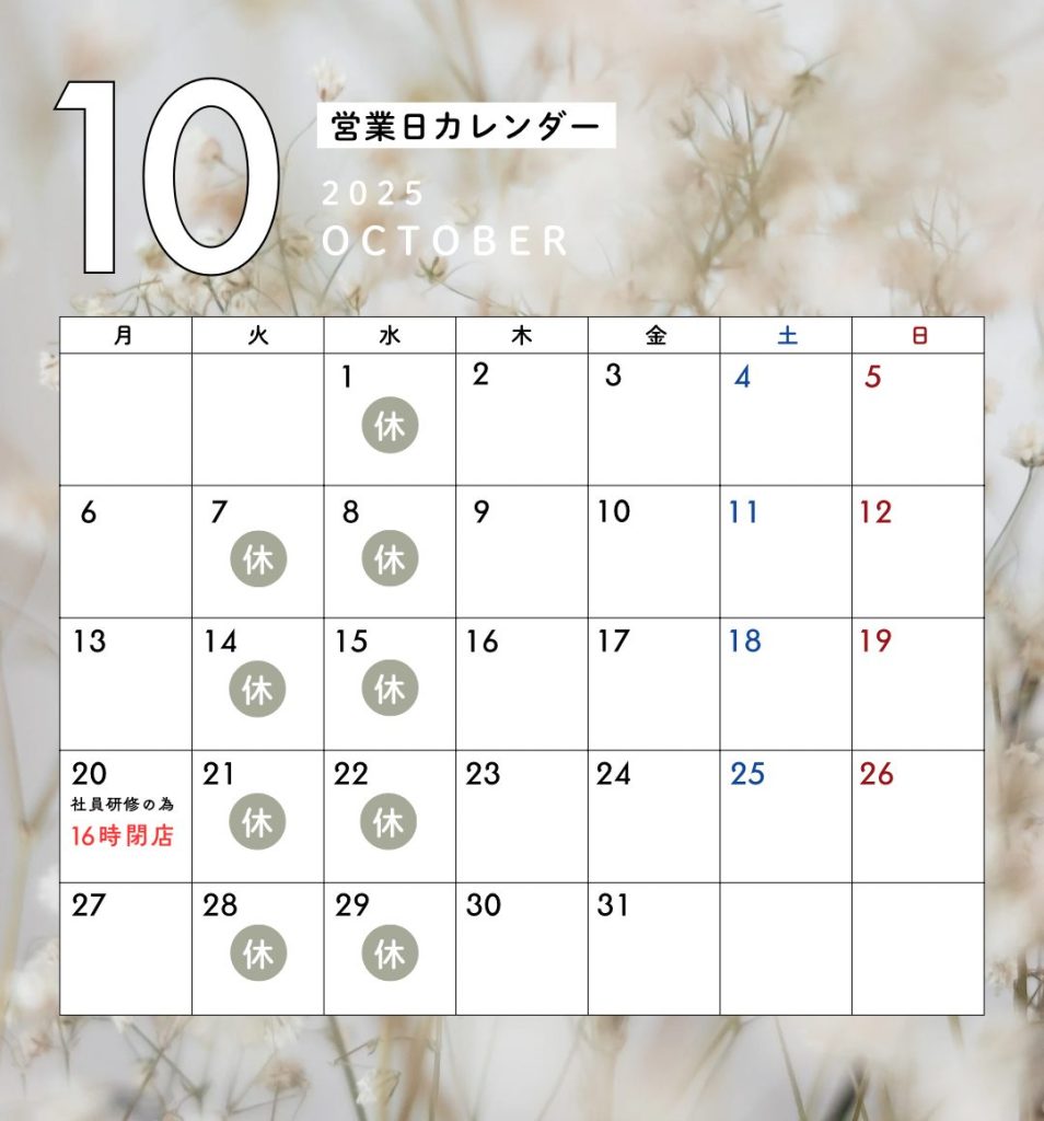 また、10月20日(月)は、社員研修の為、16時閉店とさせていただきます。